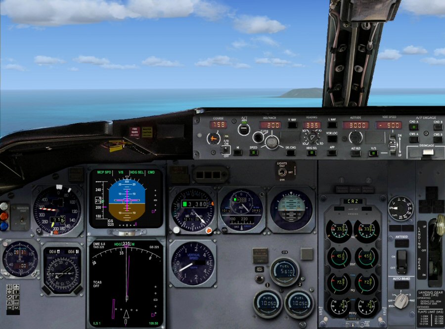 | Bon j'ai mis la fréquence de l'ILS et j'ai activé l'approche... Le pilote automatique CMD1 et CMD 2 sont activés... Tout se présente bien. On est bien aligné et le glide est bon... Tout va bien Jules... Il suffira de désactiver le pilote automatique dès que l'on touche... Ben vous ferez cela pour nous Patron... Moi je tiens le manche. |