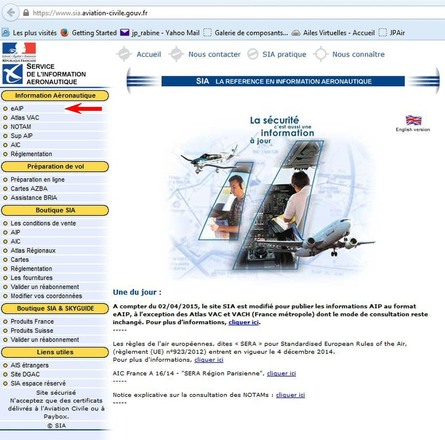 Toutes les cartes relatives à l'espace aérien francophone se trouvent sur le site web de la SIA, Depuis le 02 Avril 2015, le site SIA a été modifié et le mode opératoire de consultation des cartes a été changé. Veuillez imprimer le fichier suivant pour mieux suivre l'atelier : cartes_a_imprimer.pdf |